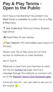 Full details can be found on www.bubwithtennisclub.co.uk. Or contact Shaun on 07802 565261.